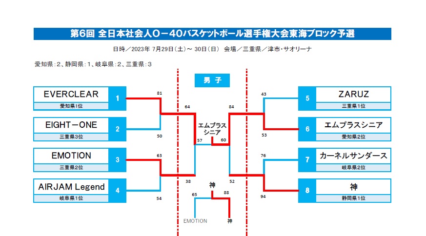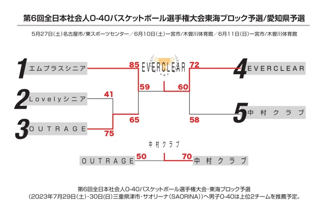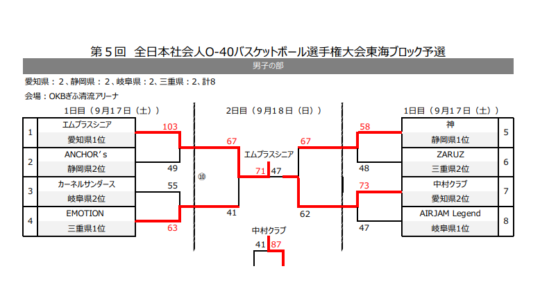 上位2チームが「第 6 回全日本社会人 O-40バスケットボール選手権大会・東海ブロック予選」へ推薦される